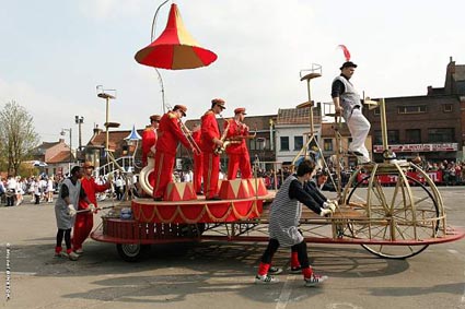 Voici quelques chars de la Cavalcade de Jemappes, construits en 2006 par Bruno Renson avec le concours l'Ecole de Promotion sociale de Jemappes, ils roulent toujours 10 ans après leur première sortie. Ces chars sont inspirés par la forme d'une péniche et la roue du chassis à molette typique des charbonnage. Deux images liées à l'histoire du Borinage. Sur l'extérieur du chassis, différents points de fixation permettent de transformer l'engin à souhait en fonction des thèmes choisis annuellement. Véritables scénographies en mouvement, ces espaces ambulant peuvent être habités par une quinzaine d'acteurs au maximum et sont poussés à la main. Le conducteur gère les virages, les démarrages et les arrêts, le freinage aussi et veille à la sécurité du public.